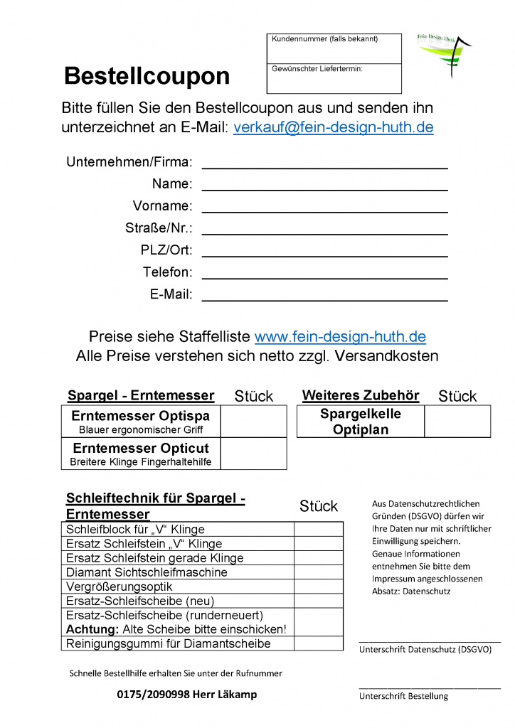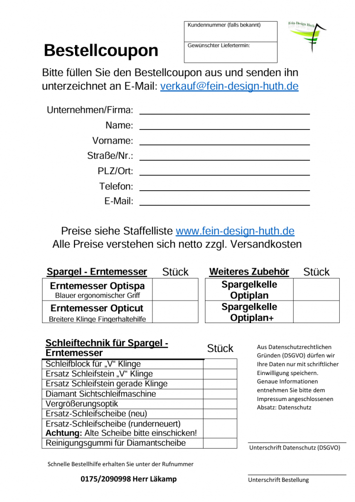 Am einfachsten ist es, Sie drucken sich den Bestellcoupon einfach aus, füllen Ihn aus und faxen Ihn zurück. Sie können uns natürlich auch gerne eine E-Mail schreiben: verkauf@fein-design-huth.de oder anrufen unter: 0175/2090998